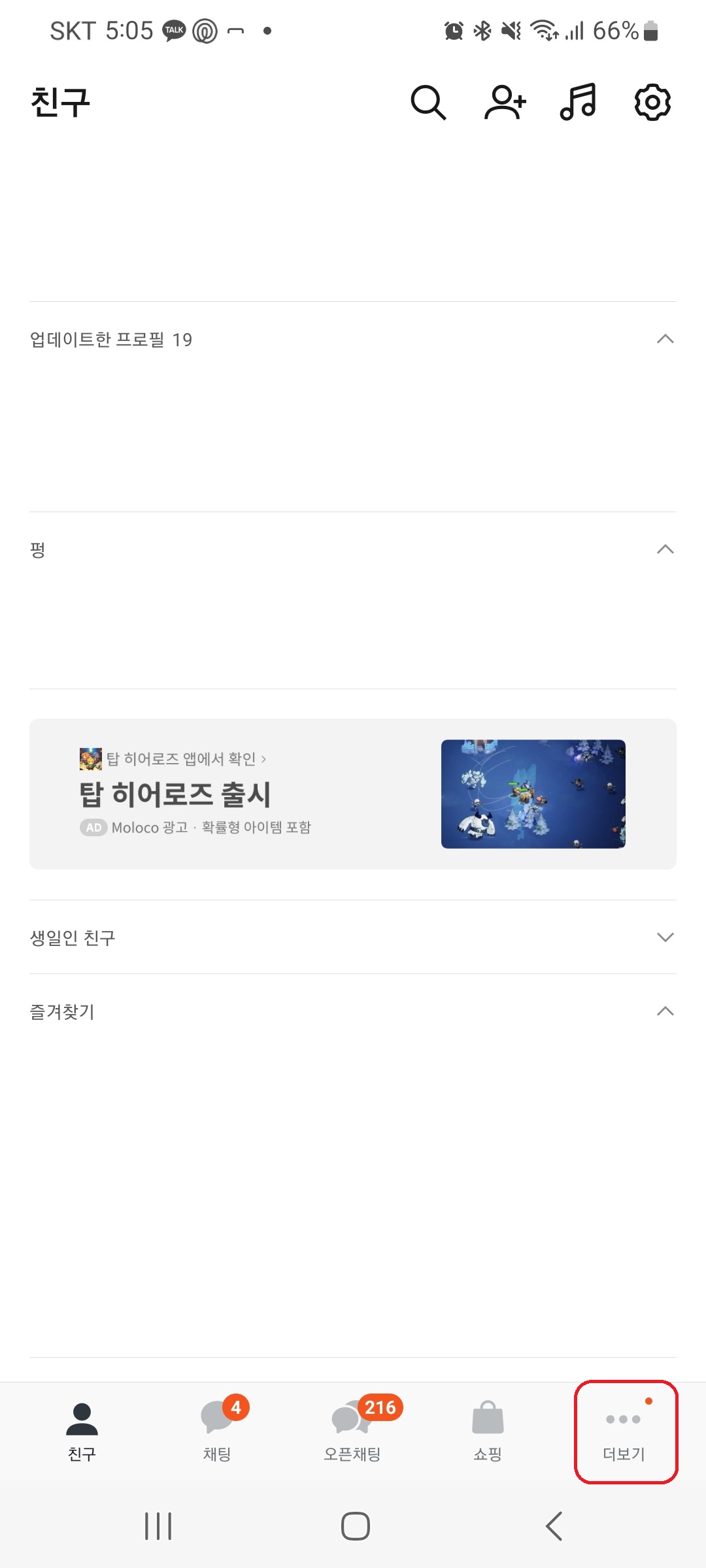 - 카카오톡 앱 실행 후 ‘더보기’ 또는 ‘나’ 탭 선택
